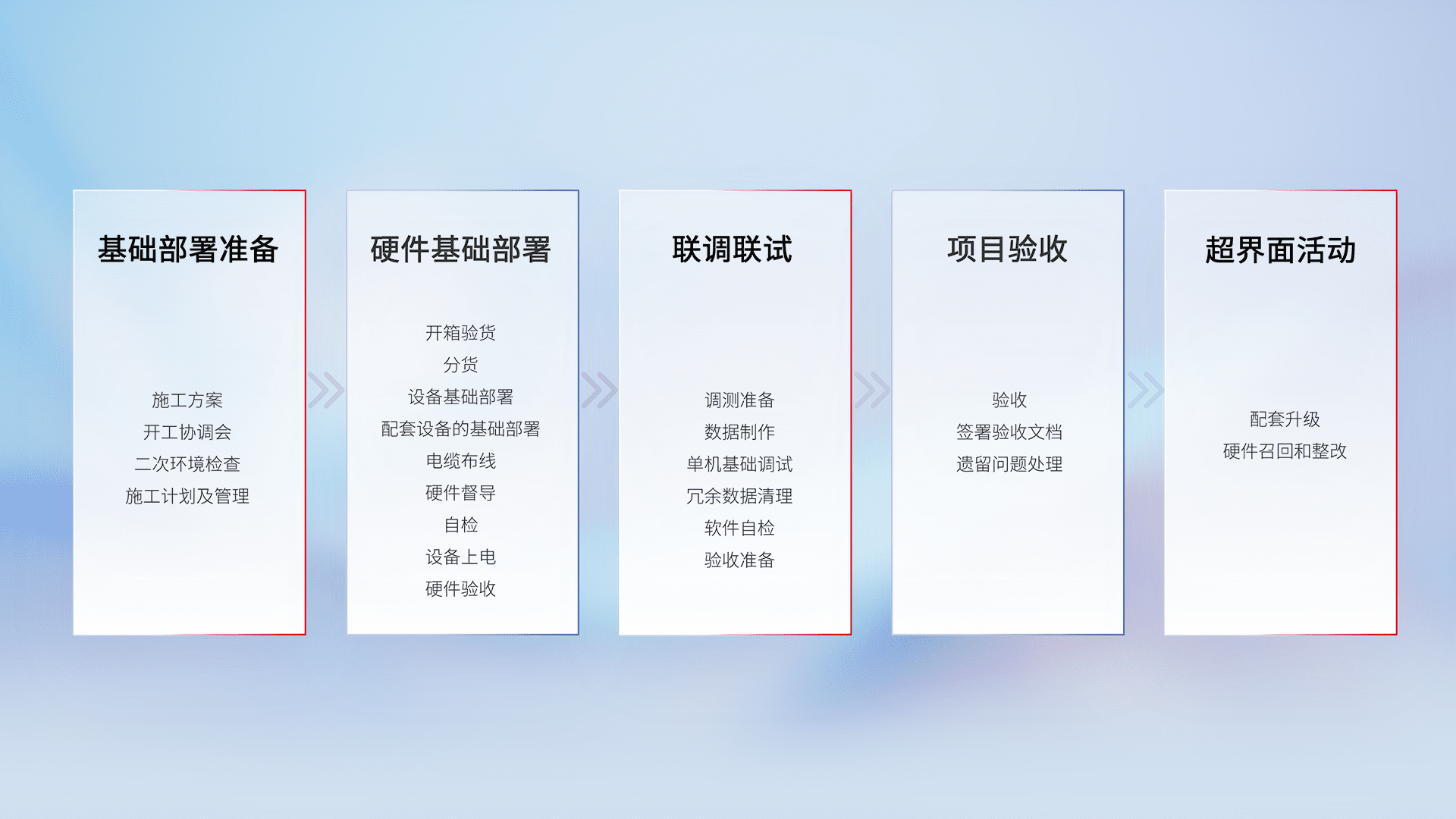 从基础部署准备、、硬件基础部署、、、、联调联试、、、、项目验收、、、、越界面活动的全过程可追溯,,,保证施工质量和进度。。